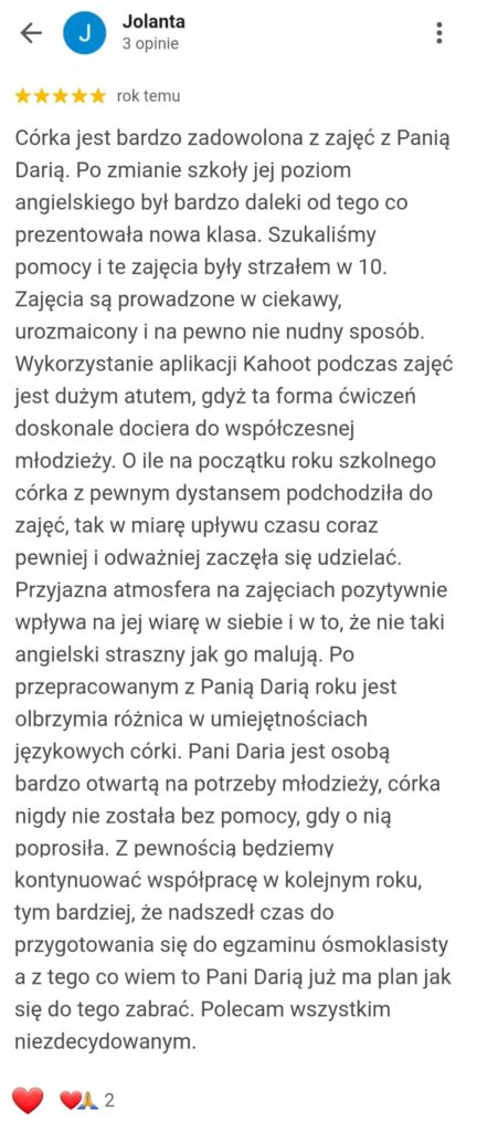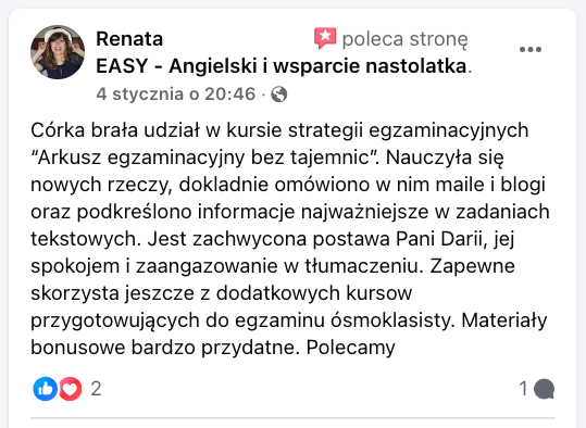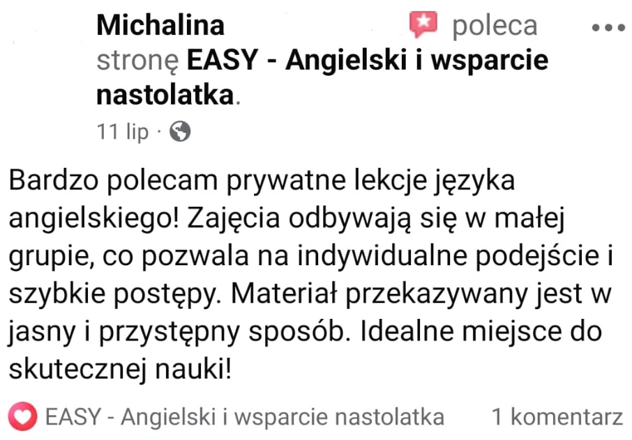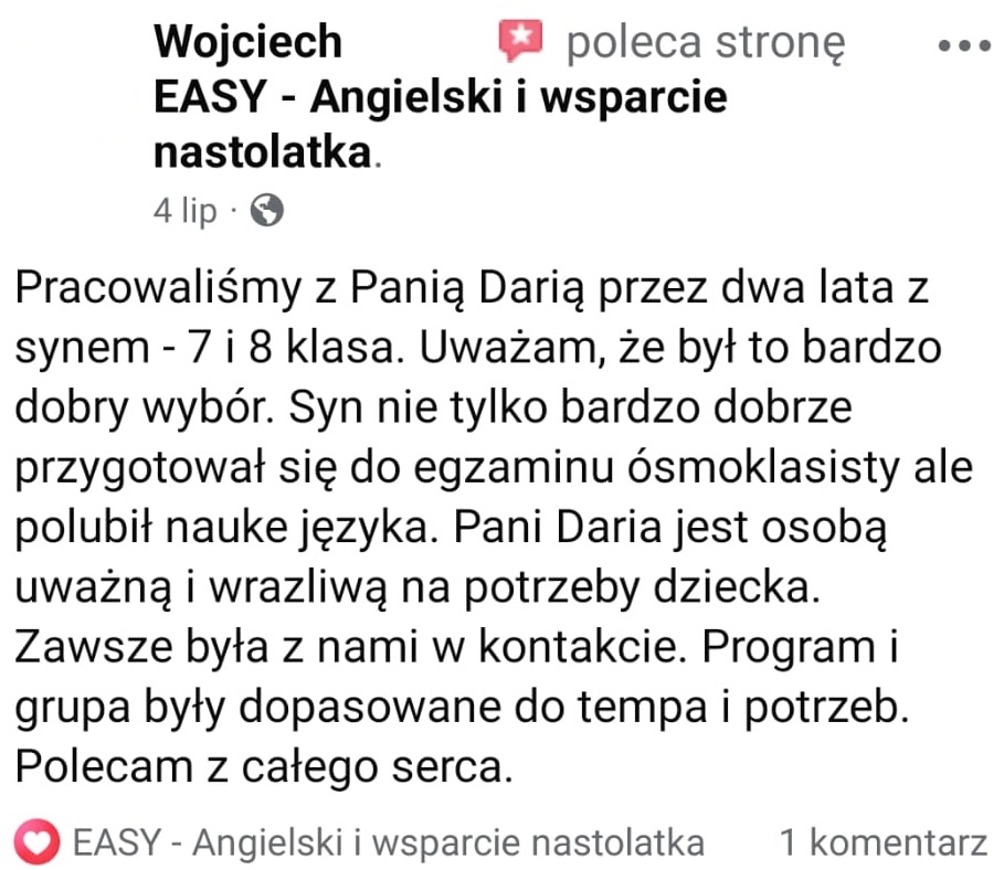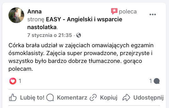 Z mojej pasji do wspierania młodych ludzi powstała moja szkoła językowa online: „EASY – Angielski i wsparcie nastolatka”. Tu na co dzień pracuję z młodzieżą starszych klas szkoły podstawowej, przygotowując uczniów do egzaminu ósmoklasisty z języka angielskiego. W tym się specjalizuję, a moi podopieczni osiągają ponadprzeciętne rezultaty!